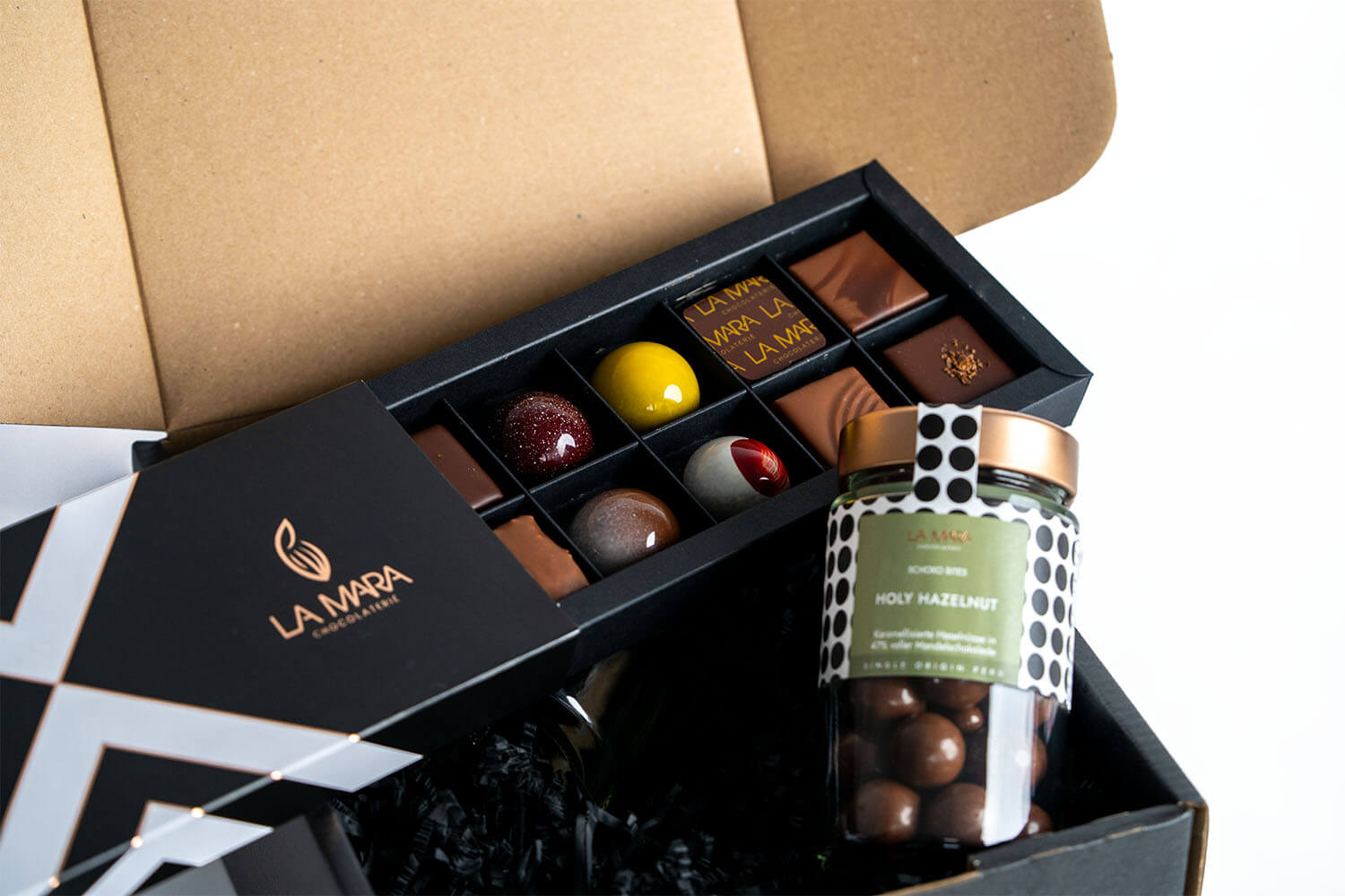 Der ultimative Vatertags-Pack mit unserer 12er Pralinenbox classy und unserer Holy Hazelnuts Schoko Bites n einer schicken Geschenkbox.