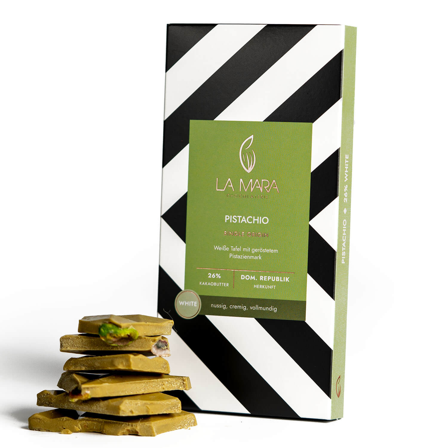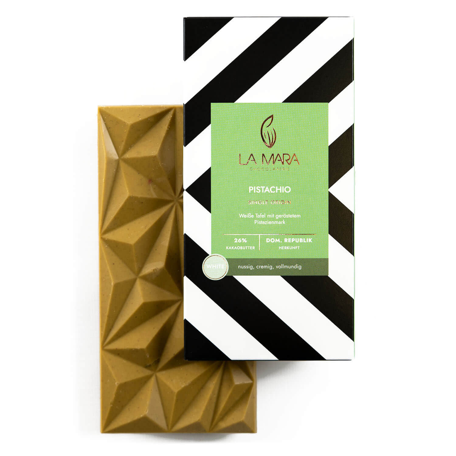 Unsere vegane PISTACHIO Schokolade verspricht cremigen Genuss! Diese zart schmelzende Tafelschokolade wird aus veganer weißer Schokolade mit vermahlenen Pistazien in Handarbeit in unserer Schoko-Manufaktur hergestellt. Der nussige, vollmundige Geschmack wird durch die Pistazien im Ganzen on Top vervollständigt!
