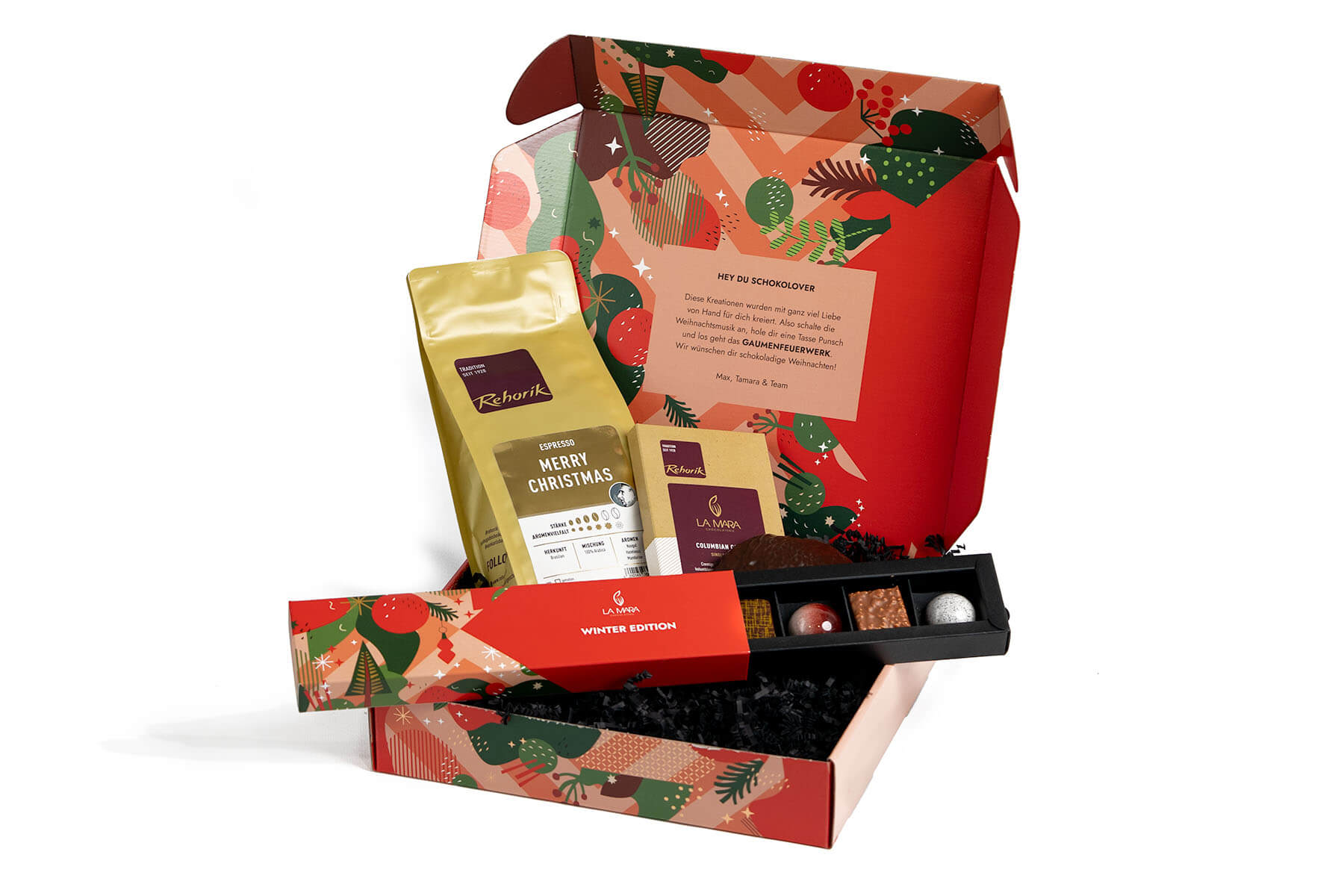 Herrlich weihnachtlich duftende vegane Schokolade: knackige, leicht karamellisierte Mandeln umhüllt mit Lebkuchen-Schokolade. Dazu unsere 12er Winter Edition mit Sorten wie Germknödl, Zwetschge Zimt oder Spekulatius Crunch. Der Schokonikolaus besteht aus creamy Mandel-Schokolade aus Peru sowie feinem Haselnussmark und Lebkuchengewürzen.