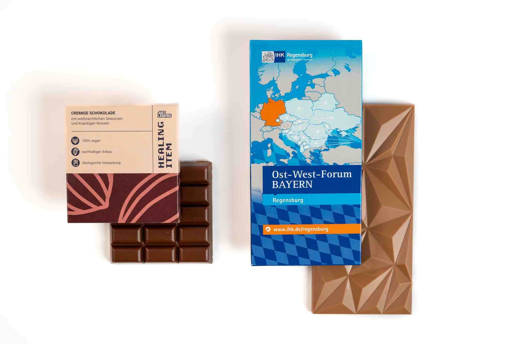 Was wäre eine leckere Schokolade ohne schicke Verpackung? Das Auge isst mit und deshalb passen wir auch die Verpackung an deine Firma an. Logobanderolen mit deiner Unternehmens-CI verleihen den Köstlichkeiten den letzten Schliff.