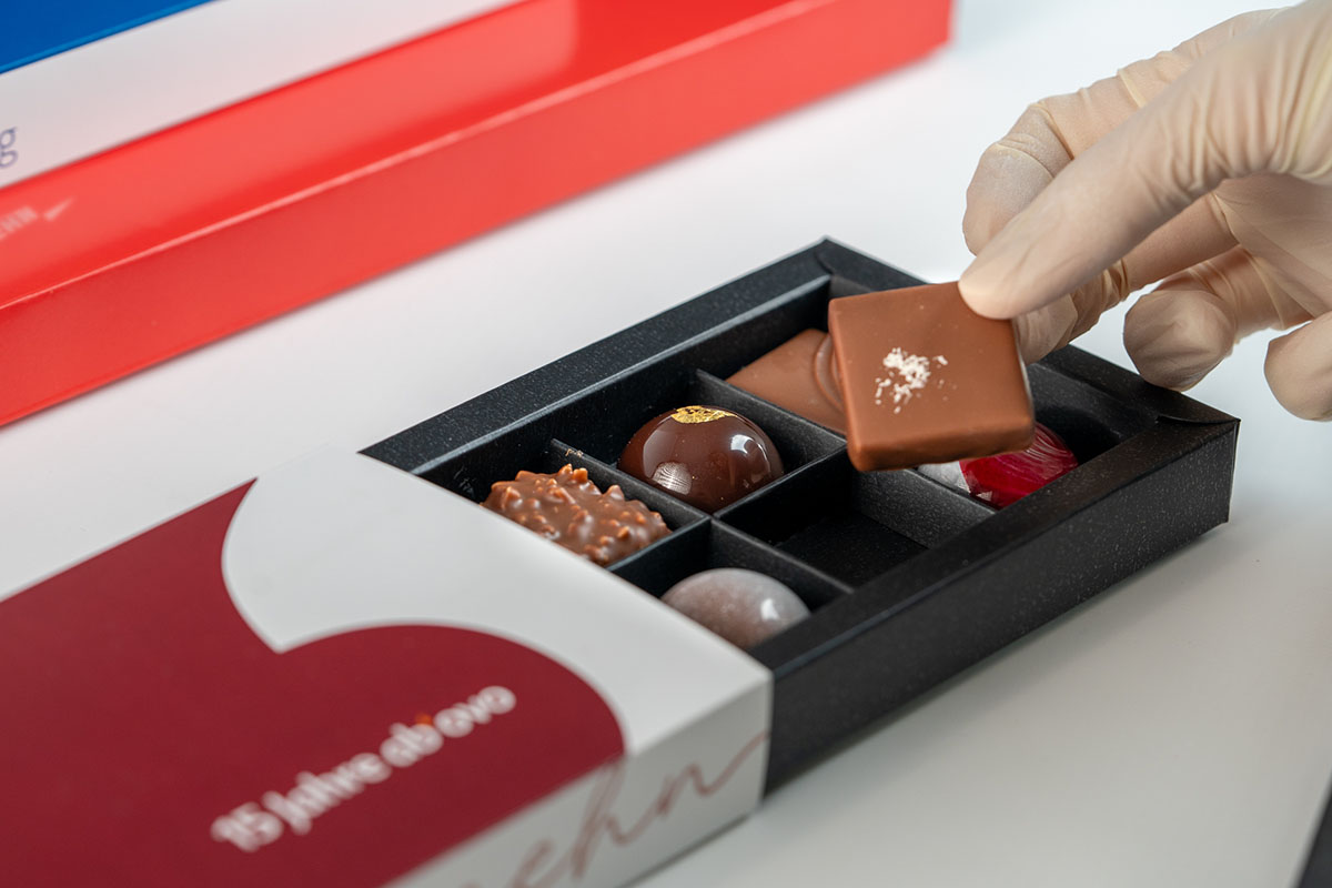 Was wäre eine leckere Schokolade ohne schicke Verpackung? Das Auge isst mit und deshalb passen wir auch die Verpackung an deine Firma an. Logobanderolen mit deiner Unternehmens-CI verleihen den Köstlichkeiten den letzten Schliff.
