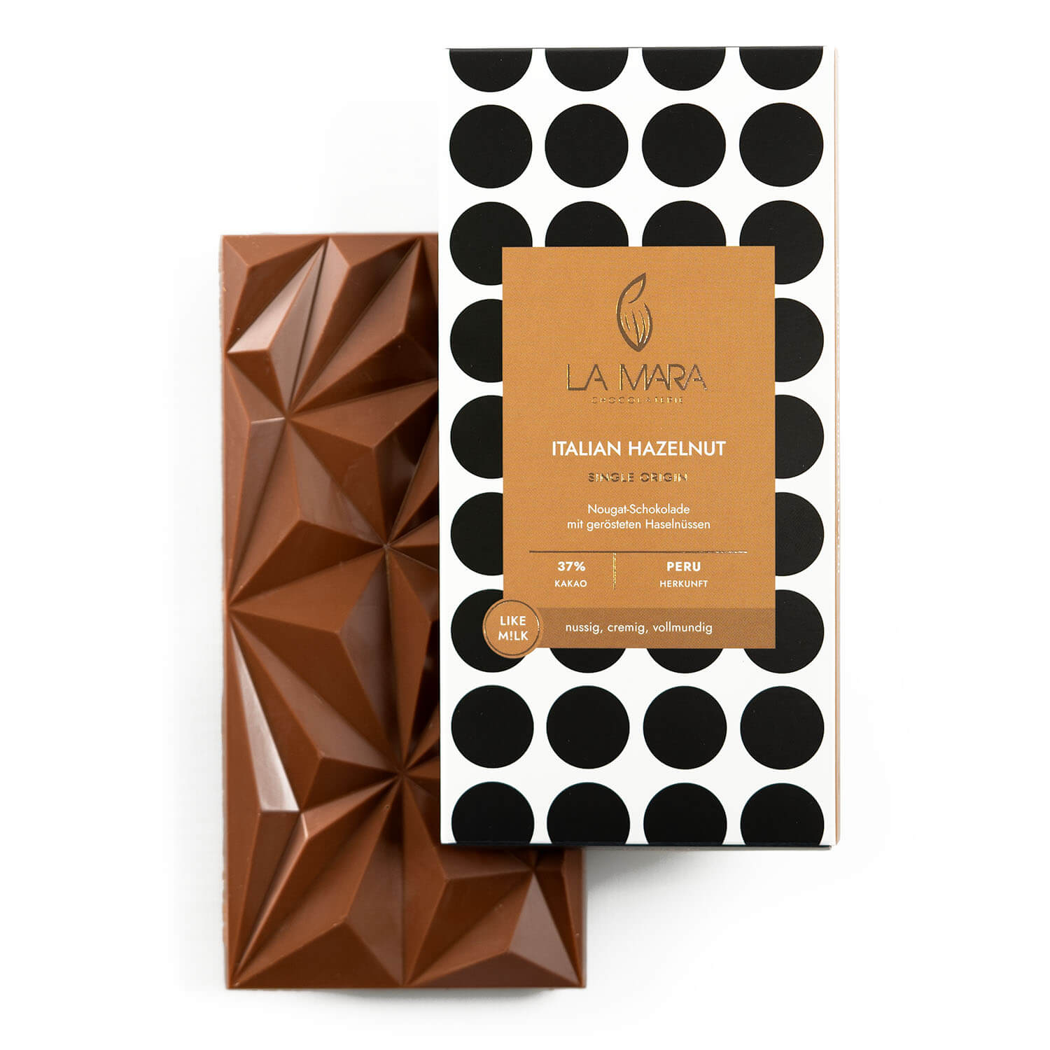 Mit gerösteten Haselnüssen verspricht die Tafelschokolade ITALIAN HAZELNUT einen nussigen Geschmack, welcher von der cremigen Nougat-Schokolade perfekt ergänzt wird. Der Kakao für diese vegane Schokolade stammt dabei aus Peru. Hergestellt wird die Tafel in Handarbeit in unserer Chocolaterie.