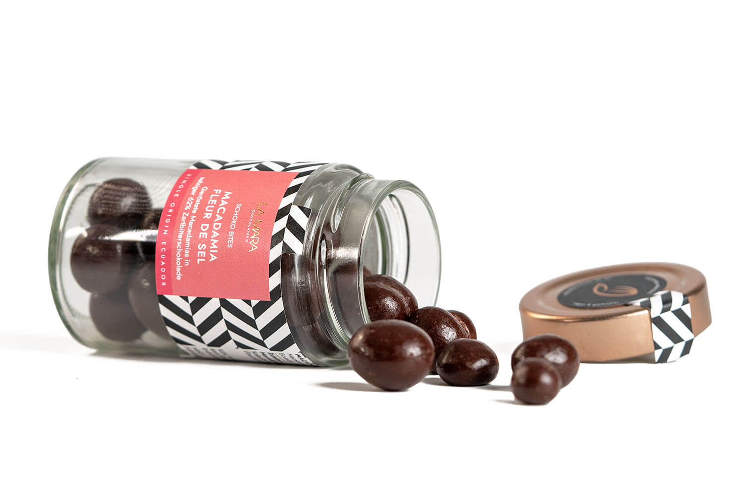 Zutaten: Macadamianüsse 33%, Zucker, Kakaobohnen, Kakaobutter, Salz 0,5%, Glukosesirup, Überzugsmittel: Gummi arabicum.