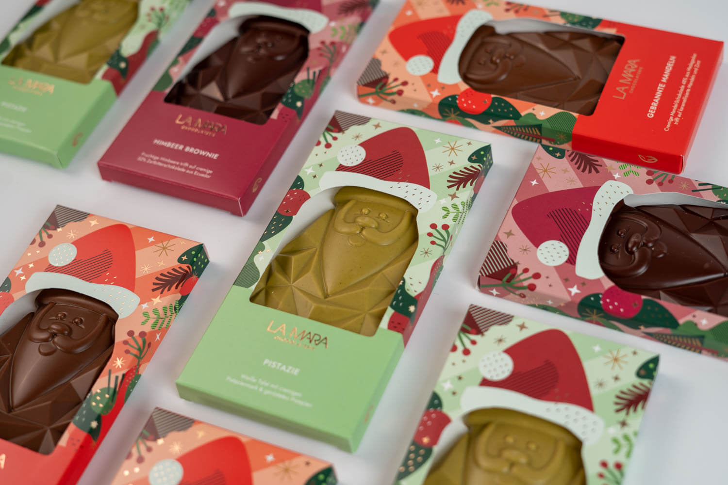Jetzt wieder da! Unsere veganen Schoko-Weihnachtsmänner – und das in drei unwiderstehlich leckeren Sorten. Himbeer Brownie, Lebkuchen Nougat und cremige Pistazie – so viele neue Yummy-Sorten, dass Weihnachten gar nicht schnell genug kommen kann. Denn was wäre die schönste Zeit des Jahres ohne einen Schokonikolaus?