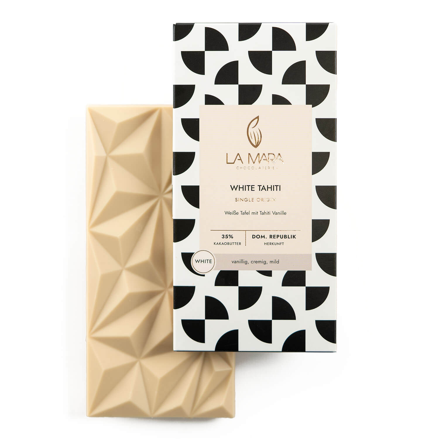 Unsere WHITE TAHITI TAFELSCHOKOLADE ist eine zart cremige vegane Schokolade mit purem Vanillegeschmack aus echter Tahiti Vanille. Kakaobutter aus der Dominikanischen Republik ist die Basis der Tafel, die in unserer Schokoladenmanufaktur in Handarbeit hergestellt wird. Cremiger Genuss ist garantiert!